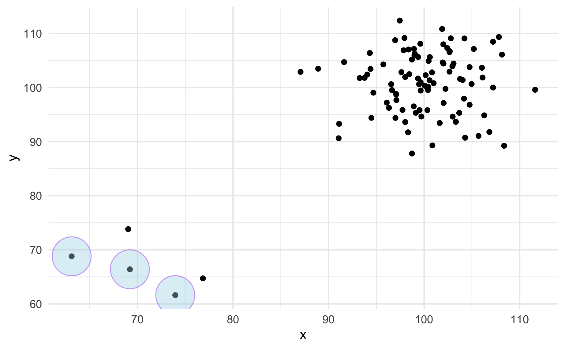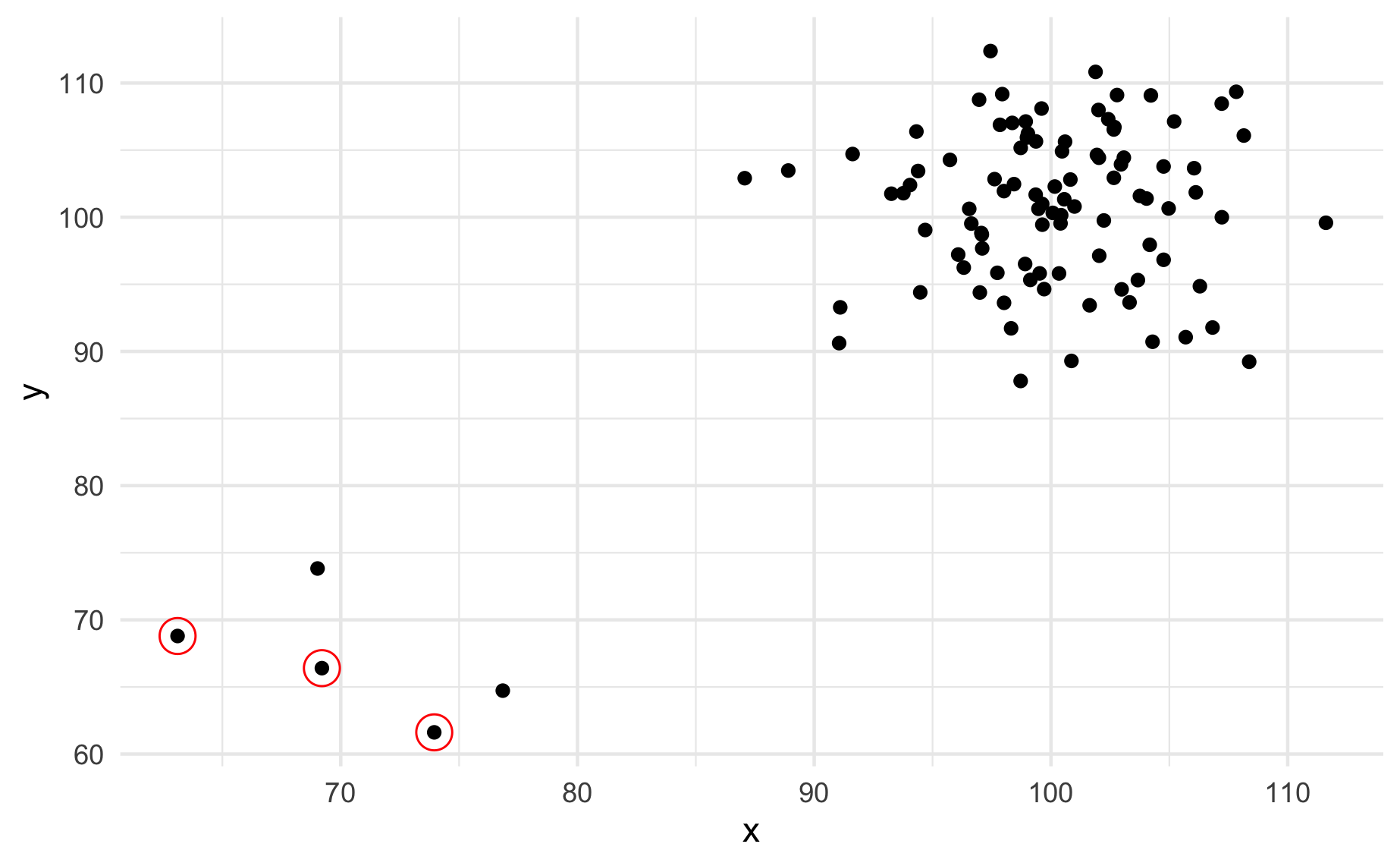 data_norm = tibble(x = c(rnorm(95, 100, 5), rnorm(5, 70, 5)),