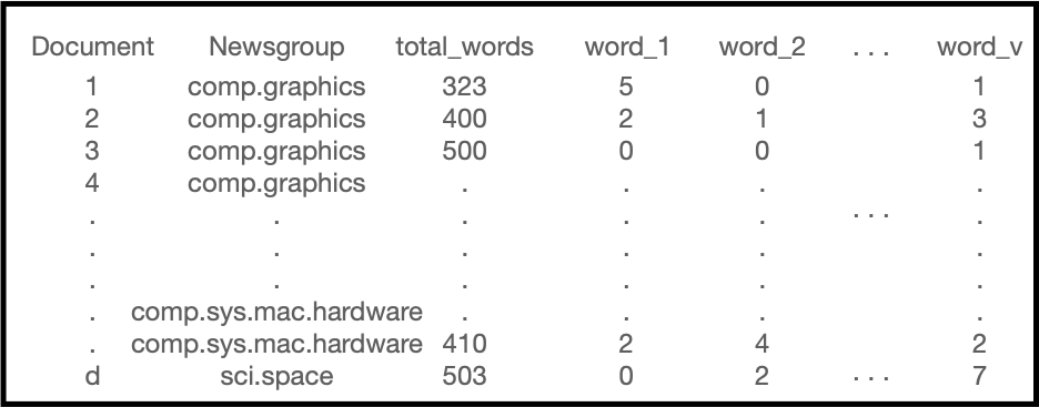 where the column Document contains the documents name or #, Newsgroup contains the category the document belongs to, total_words contains the total words in the document, word_1, word_2 up to word_v contains every word in every document and the values represent the number of occurrences of each given word in the document.