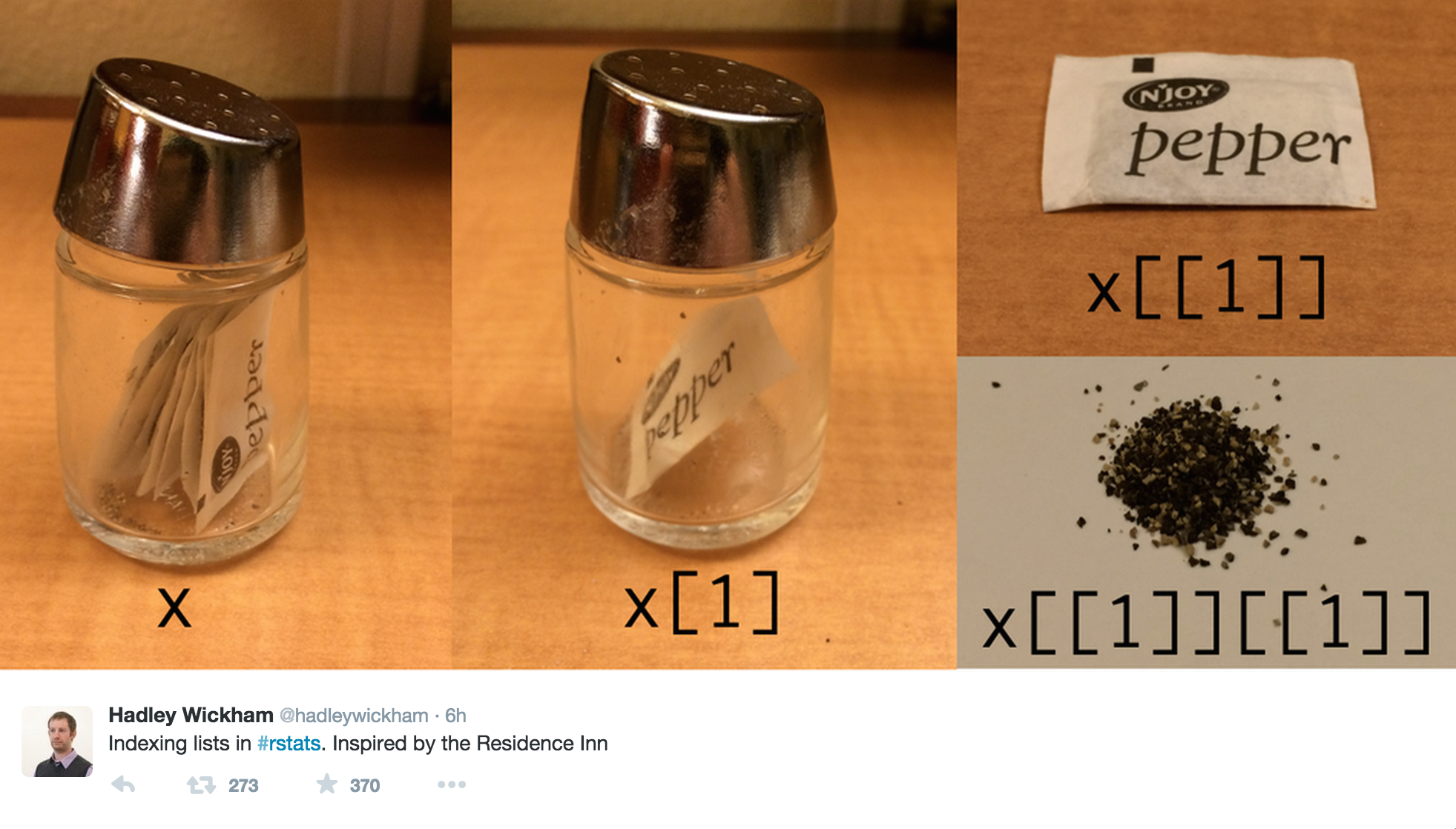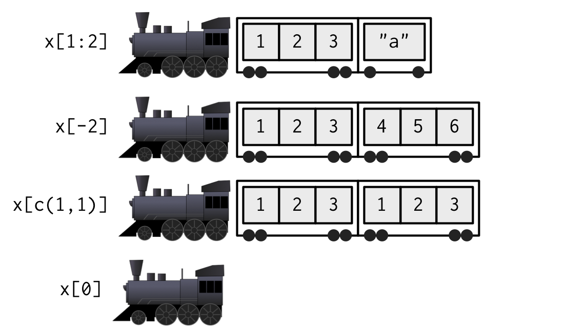 | Matrix / Array | x[[1]] x[1, ] x[, 1] |