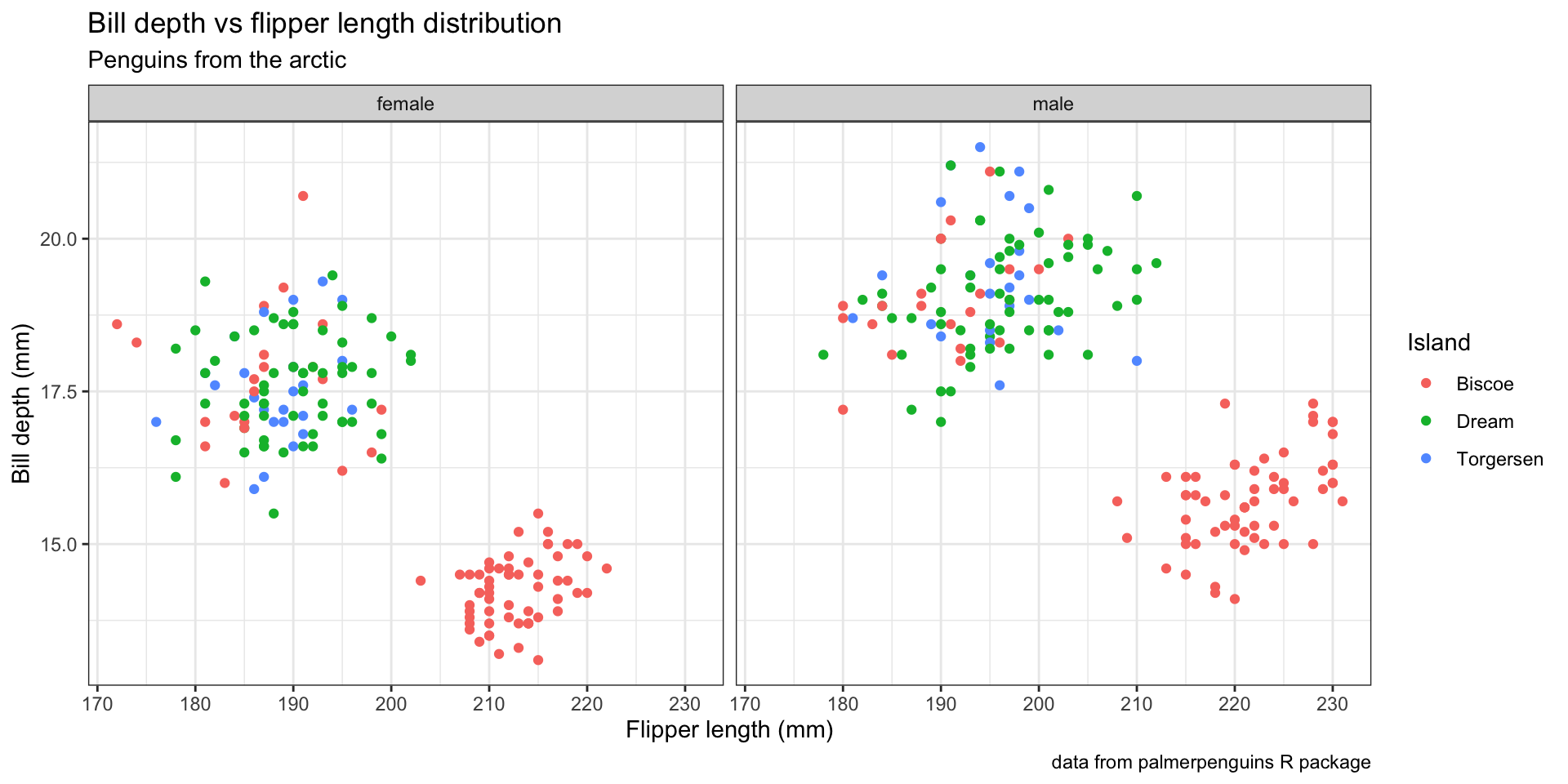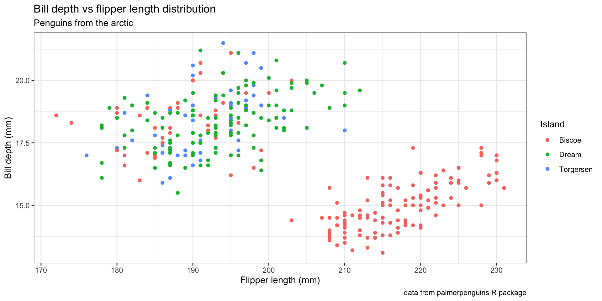 ggplot(aes(x = bill_depth_mm, y = flipper_length_mm, color = island)) +
