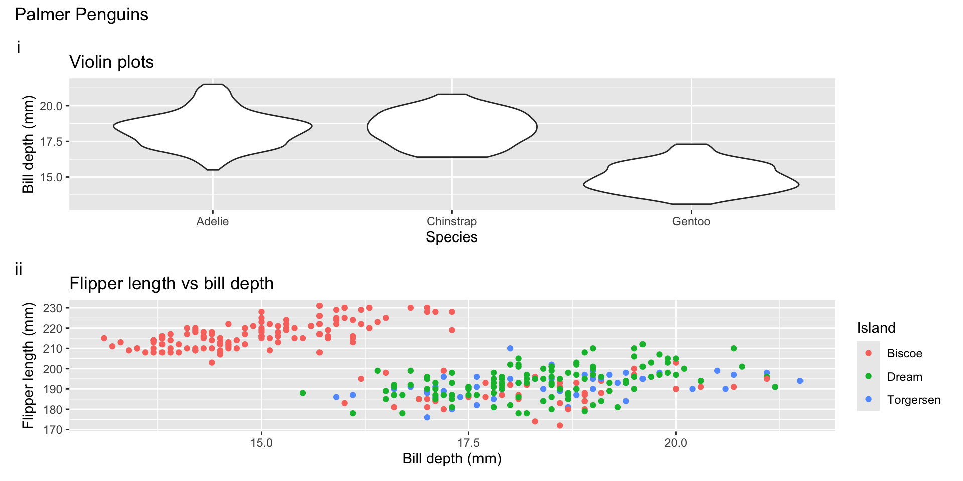 labs(x = "Flipper length (mm)", y = "Bill depth (mm)",