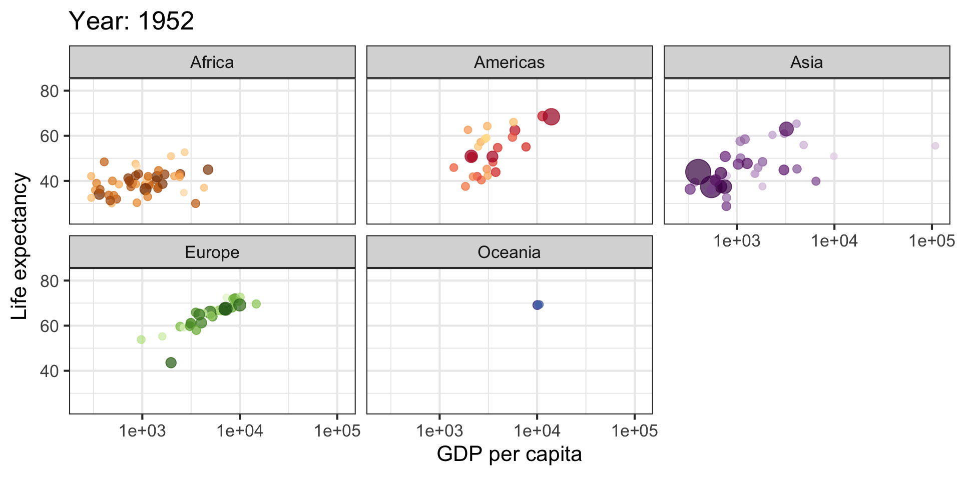 labs(title = 'Year: {frame_time}', x = 'GDP per capita', y = 'Life expectancy') +