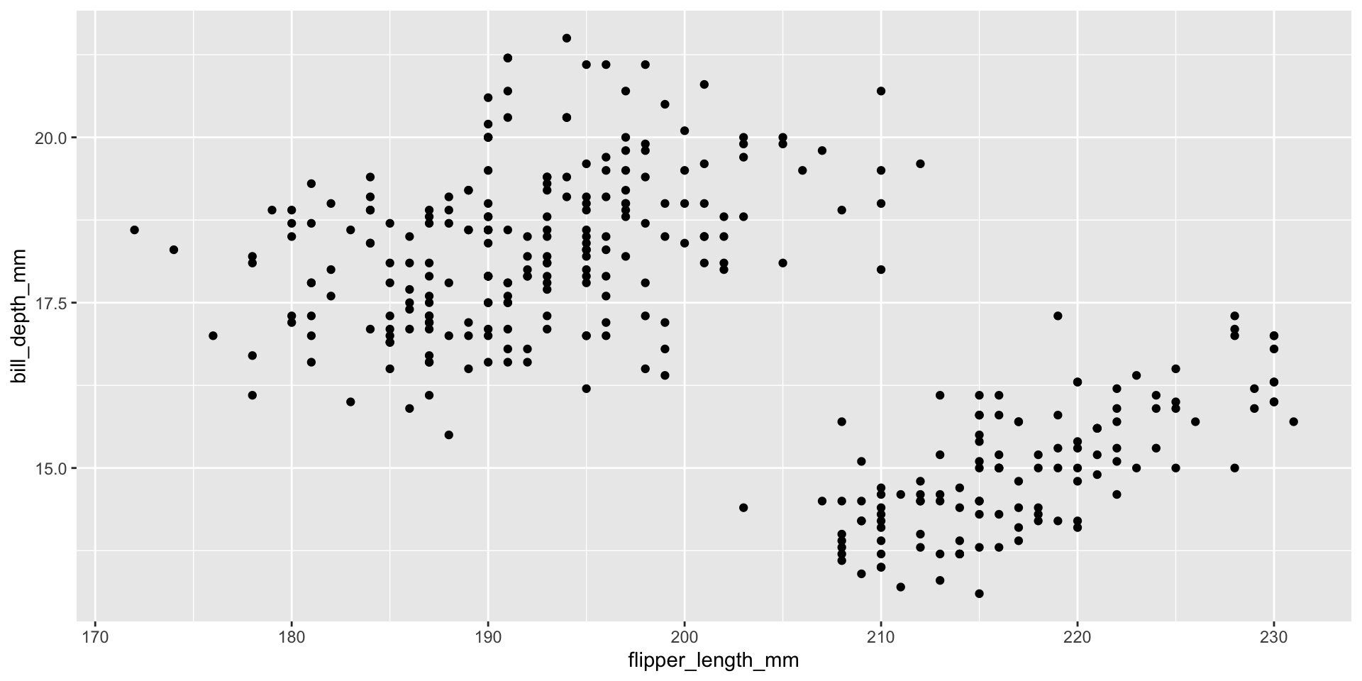 ggplot(aes(x = flipper_length_mm, y = bill_depth_mm,