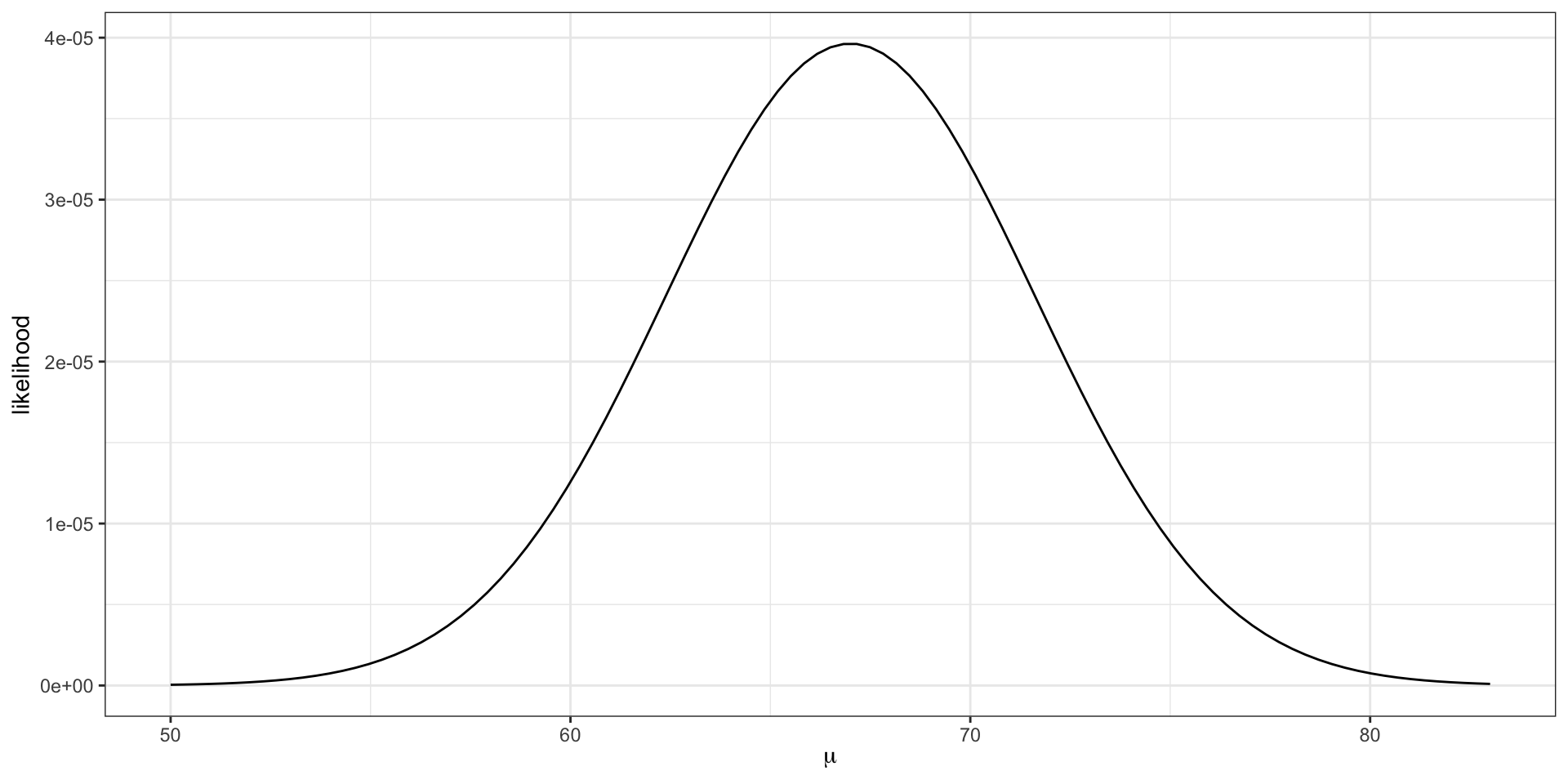 If we observe three student heart rates, {75, 58, 68} then our likelihood \[L(\mu) = f_x(75 |\mu) \cdot f_x(58|\mu) \cdot f_x(68|\mu).\] That is, the joint density function of the observed data as a function of the parameter.