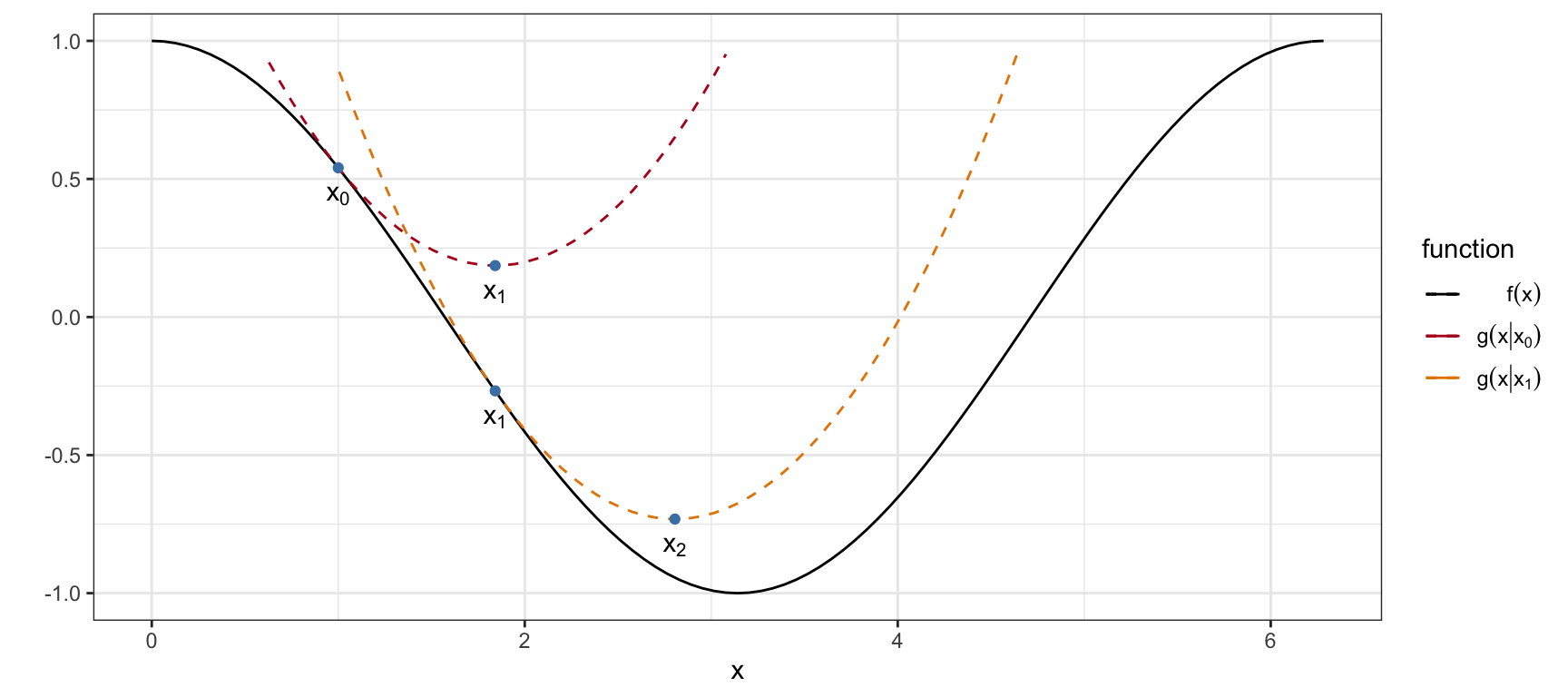 \[ g(x|x_n) = f(x_n) + f'(x_n) (x - x_n) + \frac{1}{2} B (x - x_n)^2 \]