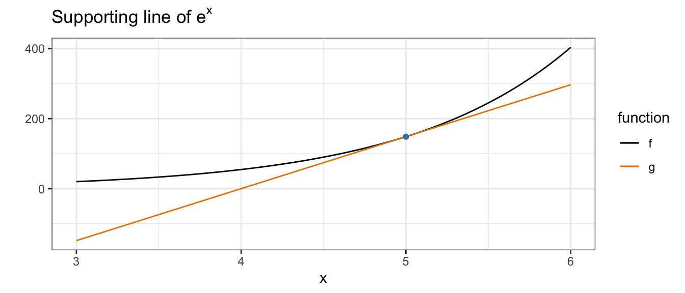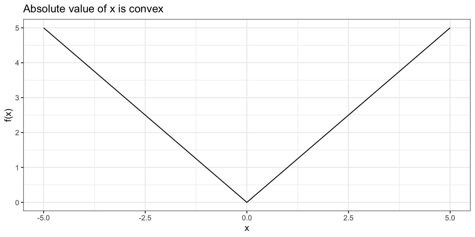 Equivalently, a function is convex if its epigraph (the points in the region above the graph of the function) form a convex set. For example, \(f(x) = |x|\) is convex by the epigraph test.